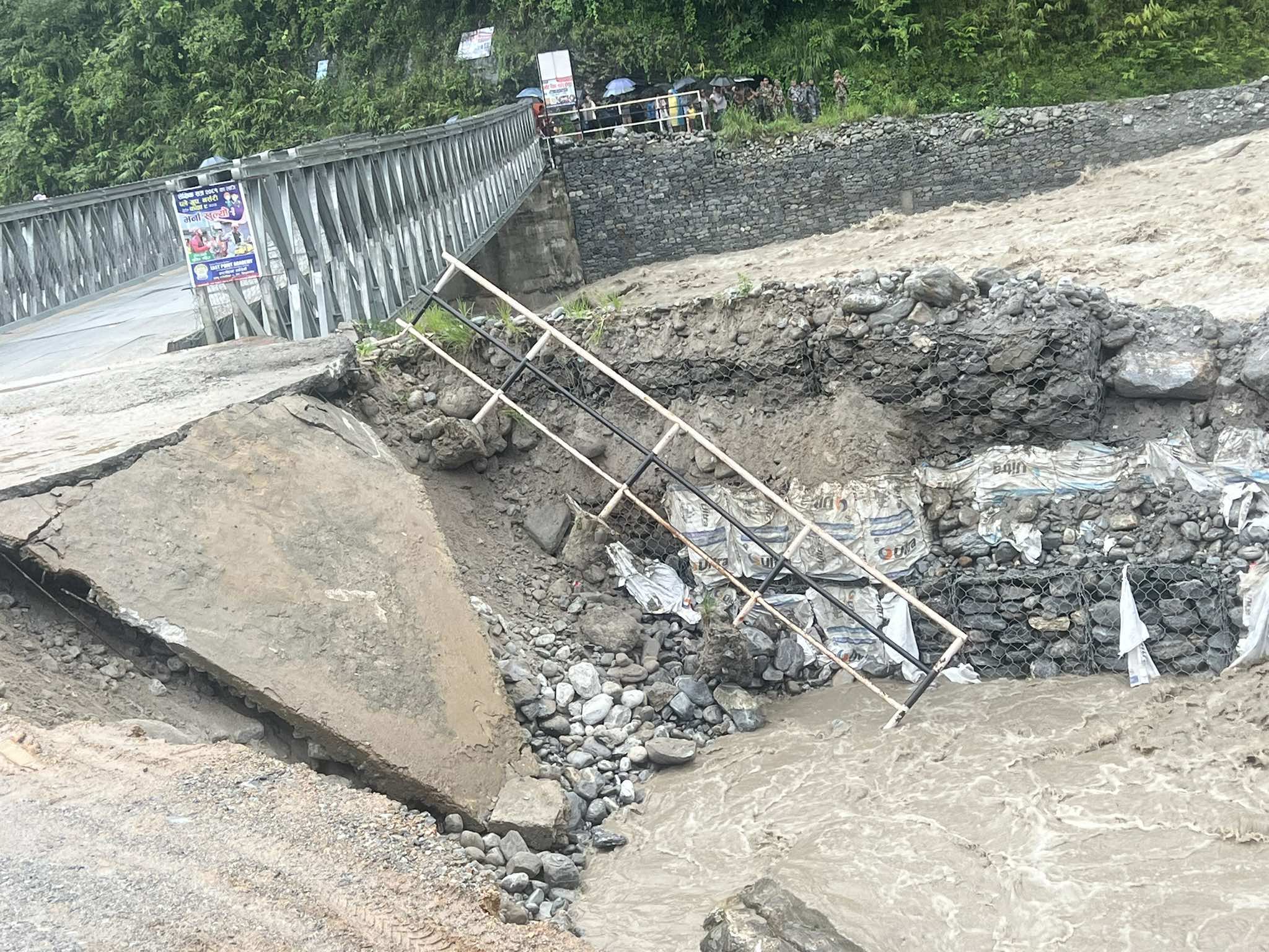 सिन्धुपाल्चोक, २३ असार : लगातारको वर्षापछि मेलम्ची खोलामा आएको बाढीका कारण सिन्धुपाल्चोकको हेलम्बु गाउँपालिकास्थित चनौटेबजारमा रहेको बेलीब्रिज बगाउने खतरा रहेको छ । बाढीले बेलीब्रिज रहेको भूभाग कटान गरिरहेको छ ।