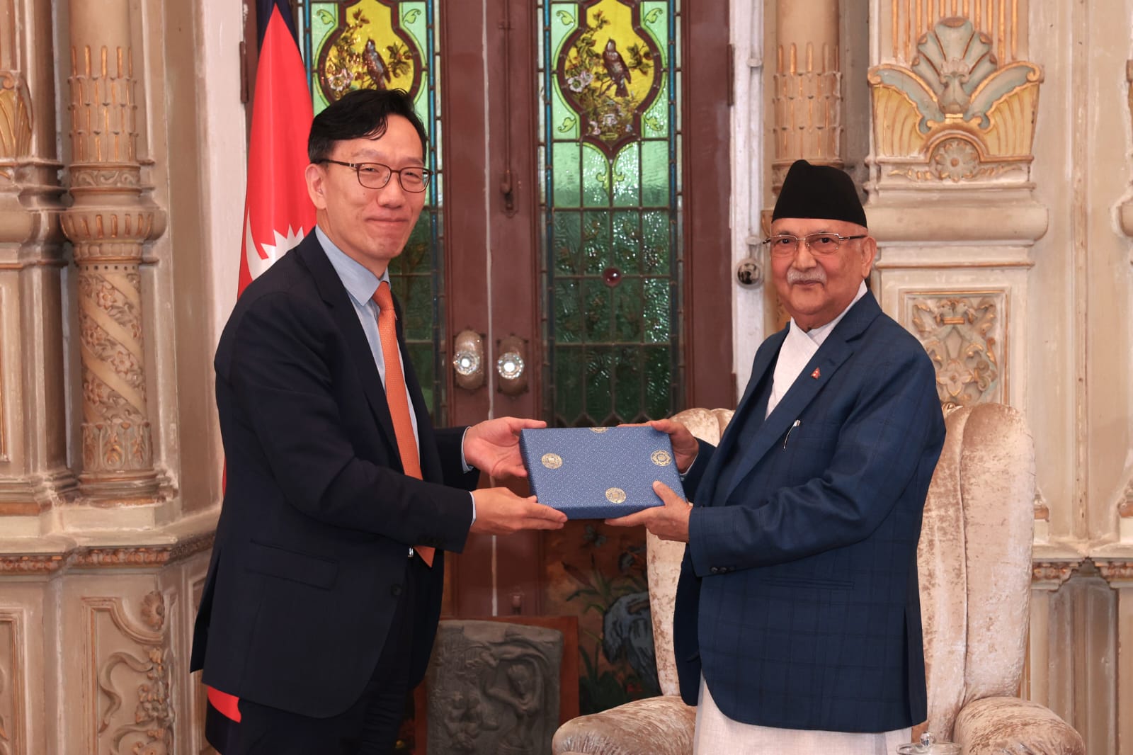काठमाडौँ, ५ भदौ : प्रधानमन्त्री केपी शर्मा ओलीसँग नेपालका लागि दक्षिण कोरियाका राजदूत पार्क ताइयोङले आज शिष्टाचार भेट गर्नुभएको छ ।