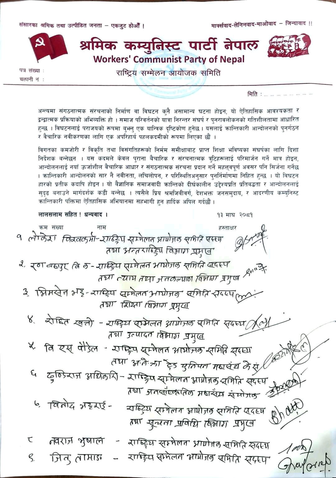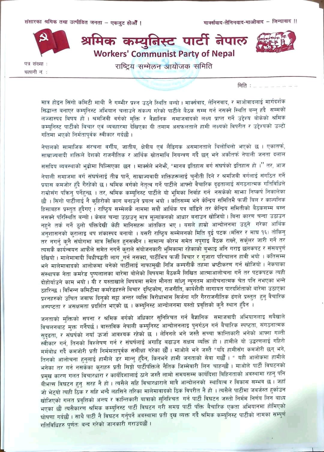 अफसोच न अभियान भयो न त राष्ट्रिय सम्मेलन । त्यसपछि गत असोज १–२ मा बसेको विस्तारित बैठक (१७ जना केन्द्रीय सदस्य सहभागी) ले गत पौष २२ गते केन्द्रीय समितिको बैठक र माघ १६ देखि २० गते सम्म राष्ट्रिय सम्मेलन गर्ने निर्णय गरी सर्कुलर जारी भएको थियो । तर कुनै पनि सूचना बिनै बैठक नबस्नु र सम्मेलन नै अनिश्चित हुनेगरी संयोजनको भूमिकामा रहेका कमरेड नै सम्पर्क बाहिर रहनु विडम्बनापूर्ण रह्यो’, विज्ञप्तिमा भनिएको छ, ‘श्रमजीवी वर्गको मुक्ति र वैज्ञानिक समाजवादको लक्ष्य प्राप्त गर्ने उद्देश्य बोकेको श्रमिक कम्युनिस्ट पार्टीको बिचार एवं व्यवहारमा देखिएका यी तमाम असफलताले हामी लक्ष्यको विपरीत र उद्देश्यको उल्टो गतिमा भएको निर्ममतापूर्वक स्वीकार गर्दछौ ।’