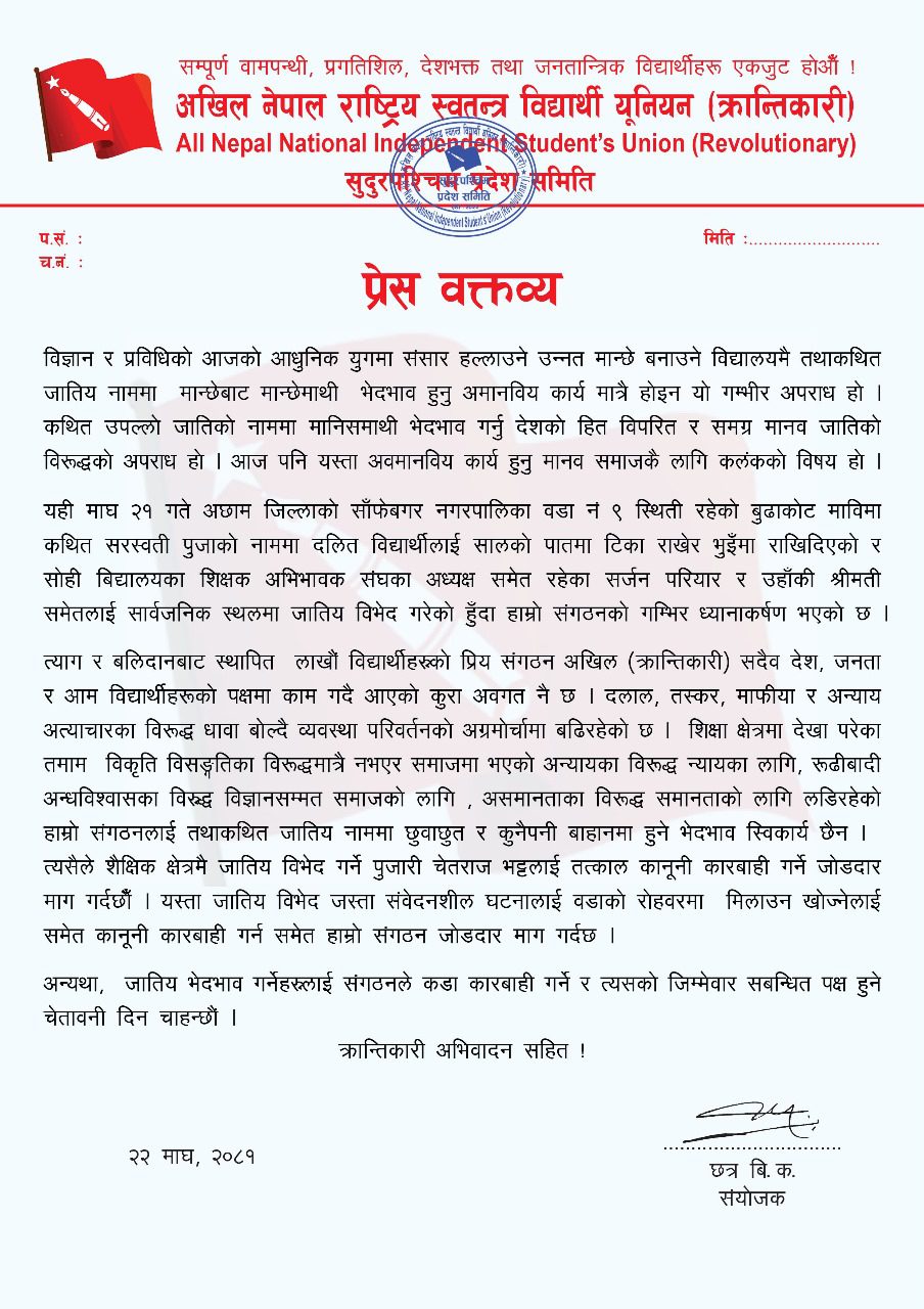 सुदूरपश्चिम प्रदेश संयोजक छत्र विकद्वारा जारी विज्ञप्तिमा भनिएको छ, “विद्यालयजस्तो शिक्षालयमा जातीय विभेदको घटनाले हाम्रो समाजमा व्याप्त अन्यायको प्रतिबिम्ब देखाएको छ। हामी कुनै पनि हालतमा यस्तो विभेद स्वीकार गर्न सक्दैनौं।”