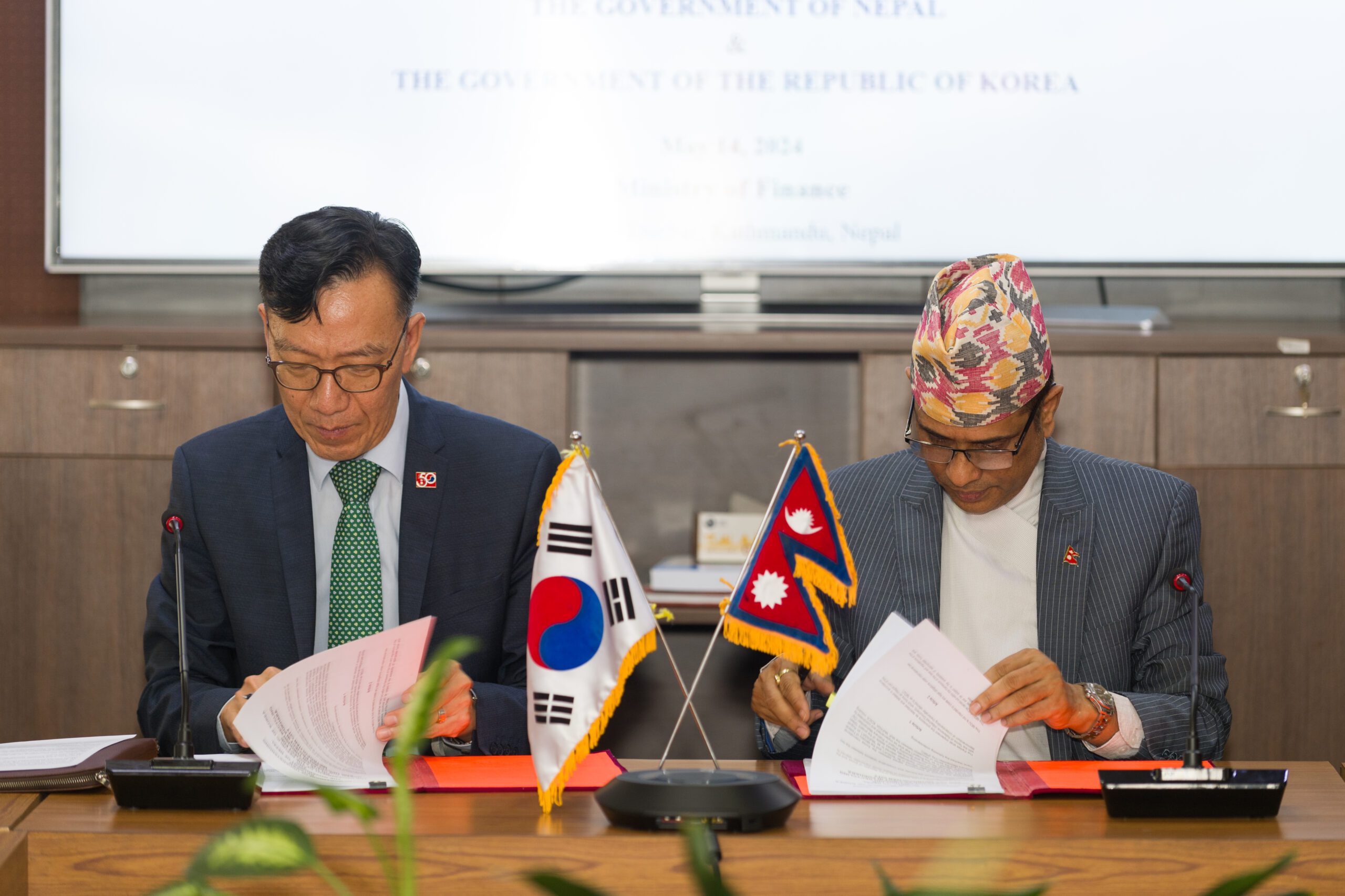 सहयोगसम्बन्धी समझदारीपत्रमा नेपालका लागि कोरियाका राजदूत तेयोङ पार्क र अर्थसचिव मधुकुमार मरासिनीले मङ्गलबार अर्थ मन्त्रालयमा आयोजित एक कार्यक्रममा हस्ताक्षर गर्नुभयो ।