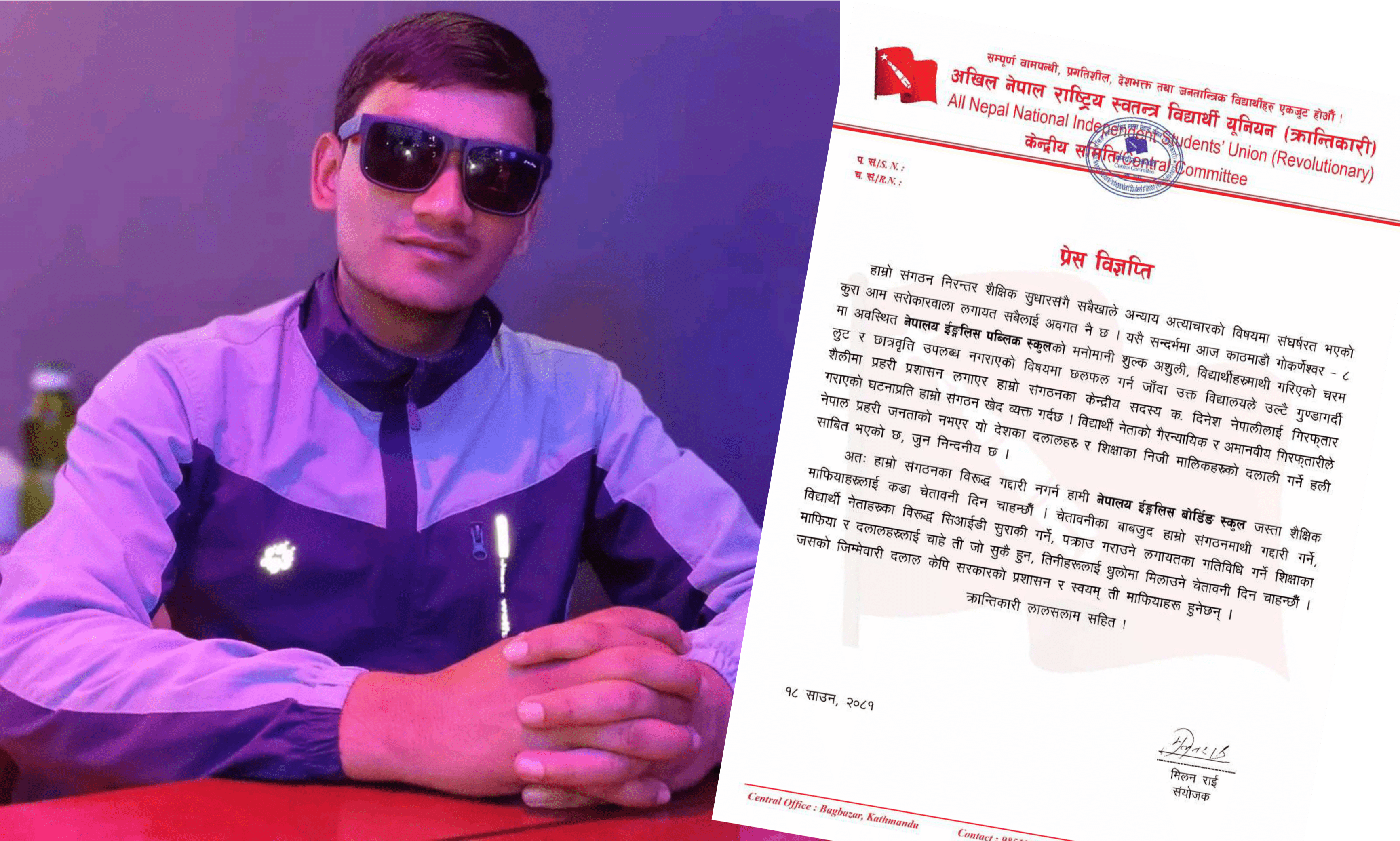 संगठनका केन्द्रीय सदस्य क.दिनेश नेपालीलाई गिरफ्तार गराएको घटनाप्रती संगठनको खेद व्यक्त रिहाई गर्न माग