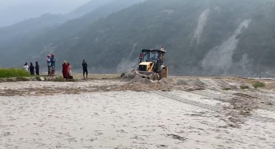 बाढीले थुपारेको गेगर हटाउन सहयोग गर्दै हलेसी तुवाचुङ नगरपालिका